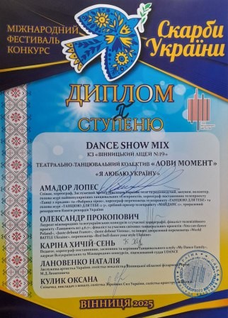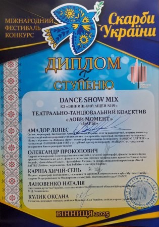 Шевчук Дар'я - «One dance», соло, хореографія, street dance, rising, teens; П'ятницька Вікторія - «Like a river», соло, хореографія, dance show, rising, junior; Григорук Анна «Fake emotions», соло, хореографія, street dance, rising, junior; Шевчук Дар'я та Кравчук Поліна (КЗ «ВЛ № 11») - дует, хореографія, street dance, mix;
