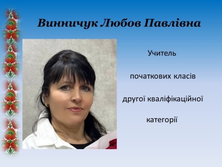 - Винничук Любов Павлівна, учитель початкових класів другої кваліфікаційної категорії;