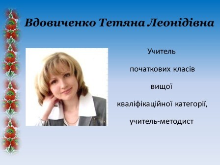 - Вдовиченко Тетяна Леонідівна, учитель початкових класів вищої кваліфікаційної категорії, учитель-методист.